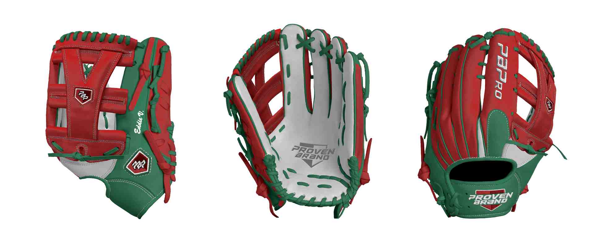 Category: PBPro Custom Product: Baseball Series: Phantom Series | USD 169.00 Glove Type: Fielders Size: 12.5" Finger Pad: With Finger Pad Web: Y web Palm: Palm (Color: White) Back Shell Main: Back Shell Main (Color: Red) Back Shell Accent: Back Shell Accent (Color: Green) Web: Web (Color: Red) Finger Pad: Finger Pad (Color: Green) Welting: Welting (Color: Green) Binding: Binding (Color: Green) Lace: Lace (Color: Green) Logo and Label-flat: Logo and Label-flat (Color: Red) Stitch: Stitch (Color: White) Embroidery: Embroidery (Color: White) Hand Throw: Right Hand Thrower Lace Length: Normal Flex (will not show in customizer): Pro Flex: (Ideal for Pro Player who wants to have more control in forming the glove) Wrist Opening (will not show in customizer): Standard Wrist Name: Eddie V. (Font Style: Brush Script MT, Font Color: White, Patch Color: N/A) Flag (Ring Finger): Mexico Remarks: N/A