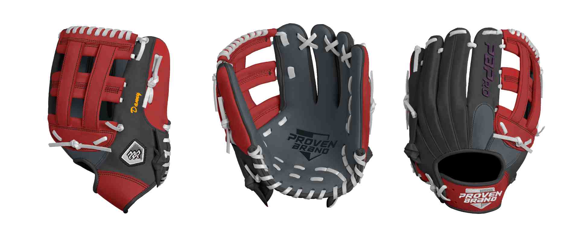 Category: PBPro Custom Product: Baseball Series: Phantom Series | USD 169.00 Glove Type: Fielders Size: 12" Finger Pad: With Finger Pad Web: Pro H Web Palm: Palm (Color: Steel Gray) Back Shell Main: Back Shell Main (Color: Black) Back Shell Accent: Back Shell Accent (Color: Red) Web: Web (Color: Red) Finger Pad: Finger Pad (Color: Steel Gray) Welting: Welting (Color: Black) Binding: Binding (Color: Black) Lace: Lace (Color: White) Logo and Label-flat: Logo and Label-flat (Color: White) Stitch: Stitch (Color: Black) Embroidery: Embroidery (Color: Purple) Hand Throw: Left Hand Thrower Lace Length: Normal Flex (will not show in customizer): Standard Flex: ( Ideal for Youth Player. Glove still needs to break in) Wrist Opening (will not show in customizer): Standard Wrist Name: Danny (Font Style: Brush Script MT, Font Color: Golden Yellow, Patch Color: N/A) Flag (Ring Finger): United States Remarks: N/A