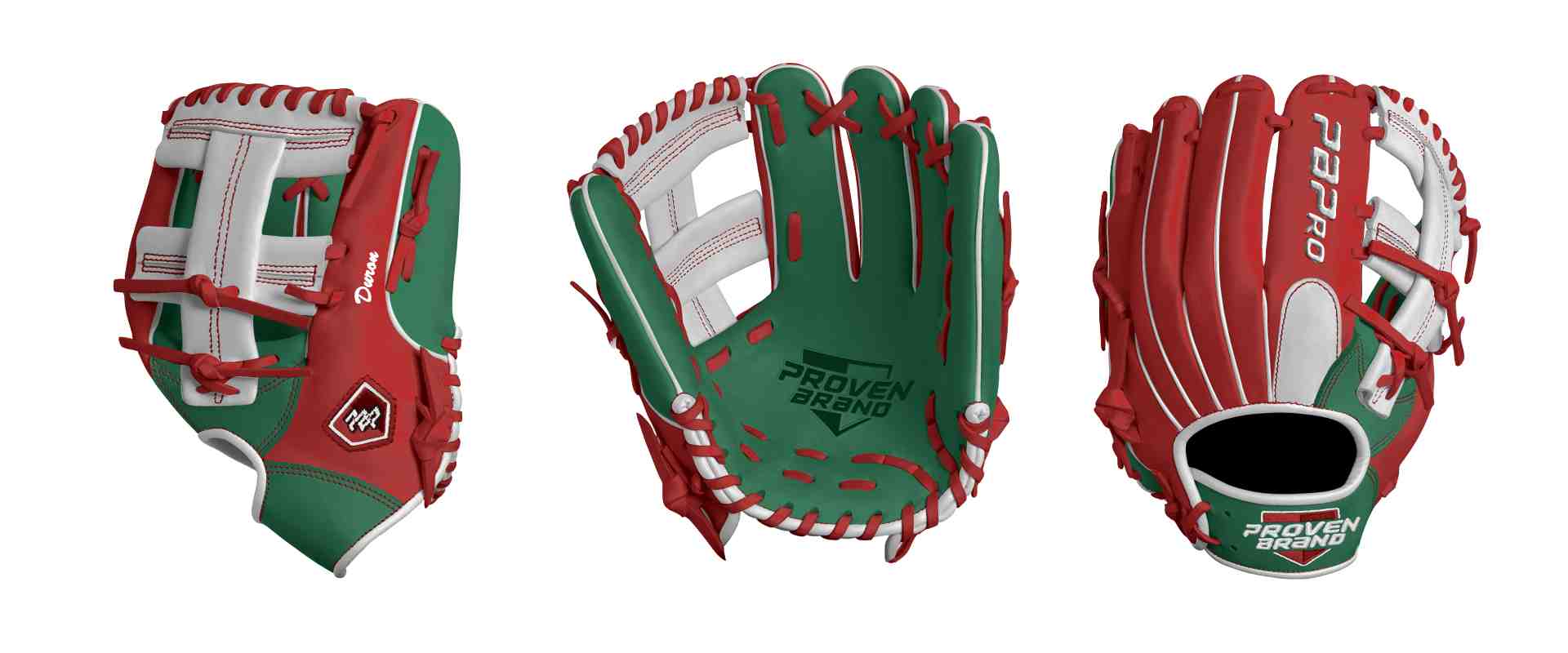 Category: PBPro Custom Product: Baseball Series: Phantom Series | USD 169.00 Glove Type: Fielders Size: 11.5 Finger Pad: With Finger Pad Web: New Cross Web Palm: Palm (Color: Green) Back Shell Main: Back Shell Main (Color: Red) Back Shell Accent: Back Shell Accent (Color: Green) Web: Web (Color: White) Finger Pad: Finger Pad (Color: White) Welting: Welting (Color: White) Binding: Binding (Color: White) Lace: Lace (Color: Red) Logo and Label-flat: Logo and Label-flat (Color: Red) Stitch: Stitch (Color: Red) Embroidery: Embroidery (Color: White) Hand Throw: Left Hand Thrower Lace Length: Normal Flex (will not show in customizer): Pro Flex: (Ideal for Pro Player who wants to have more control in forming the glove) Wrist Opening (will not show in customizer): Custom Wrist : (Player can put their wrist circumference in the remarks section and we'll adjust the fit on the wrist) Name: Duron (Font Style: Brush Script MT, Font Color: White, Patch Color: N/A) Flag (Ring Finger): Mexico Remarks: N/A