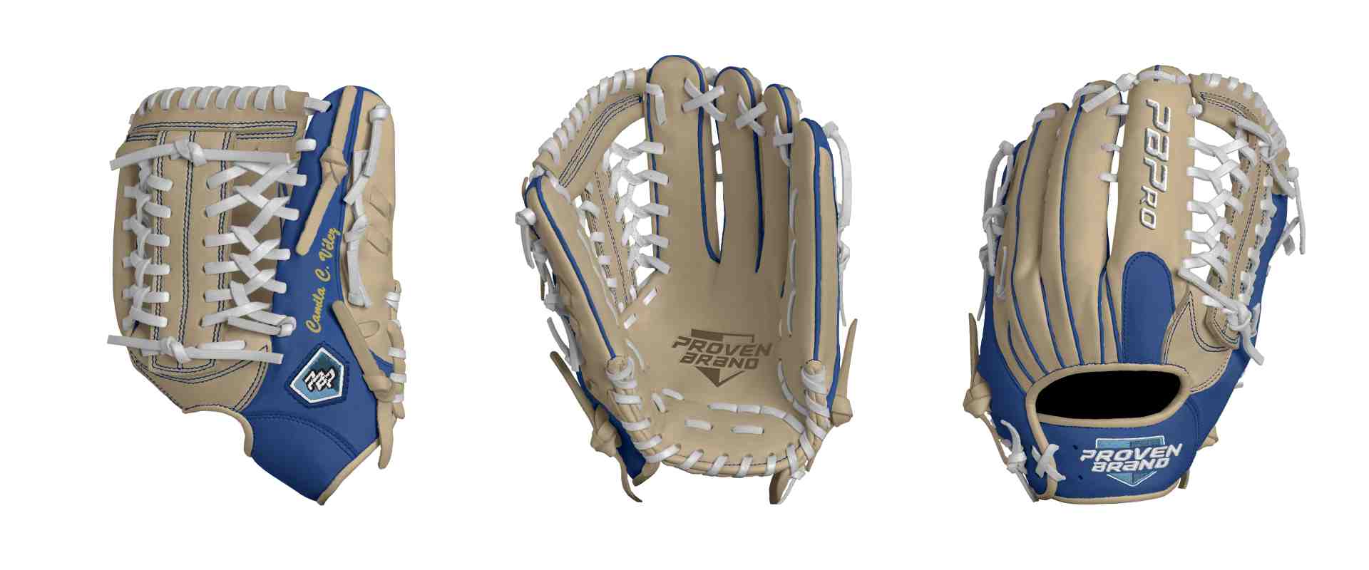 Category: PBPro Custom Product: Baseball Series: Phantom Series | USD 169.00 Glove Type: Fielders Size: 12.5" Finger Pad: With Finger Pad Web: Modified Trap Web Palm: Palm (Color: Cream) Back Shell Main: Back Shell Main (Color: Cream) Back Shell Accent: Back Shell Accent (Color: Royal) Web: Web (Color: Cream) Finger Pad: Finger Pad (Color: Royal) Welting: Welting (Color: Royal) Binding: Binding (Color: Cream) Lace: Lace (Color: White) Logo and Label-flat: Logo and Label-flat (Color: Columbia Blue) Stitch: Stitch (Color: Royal) Embroidery: Embroidery (Color: White) Hand Throw: Right Hand Thrower Lace Length: Long (will not show in customizer) Flex (will not show in customizer): Pro Flex: (Ideal for Pro Player who wants to have more control in forming the glove) Wrist Opening (will not show in customizer): Standard Wrist Name: Camila C. Vélez (Font Style: Brush Script MT, Font Color: Vegas Gold, Patch Color: N/A) Flag (Ring Finger): Puerto Rico Remarks: N/A