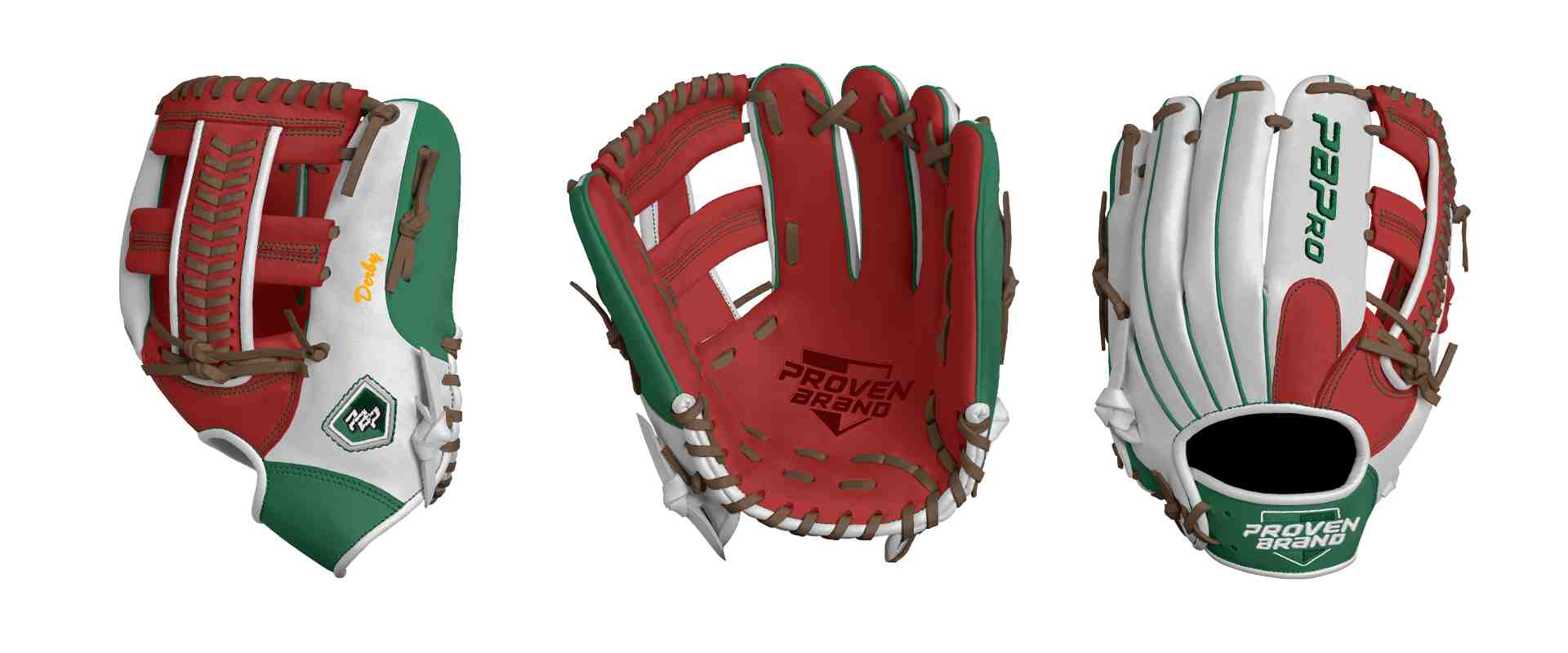 Category: PBPro Custom Product: Baseball Series: Phantom Series | USD 169.00 Glove Type: Fielders Size: 11.75" Finger Pad: With Finger Pad Web: X-Laced Single Post Web Palm: Palm (Color: Red) Back Shell Main: Back Shell Main (Color: White) Back Shell Accent: Back Shell Accent (Color: Green) Web: Web (Color: Red) Finger Pad: Finger Pad (Color: Red) Welting: Welting (Color: Green) Binding: Binding (Color: White) Lace: Lace (Color: Dark Brown) Logo and Label-flat: Logo and Label-flat (Color: Green) Stitch: Stitch (Color: Green) Embroidery: Embroidery (Color: Green) Hand Throw: Right Hand Thrower Lace Length: Normal Flex (will not show in customizer): Pro Flex: (Ideal for Pro Player who wants to have more control in forming the glove) Wrist Opening (will not show in customizer): Standard Wrist Name: Derby (Font Style: Brush Script MT, Font Color: Golden Yellow, Patch Color: N/A) Flag (Ring Finger): Mexico Remarks: N/A