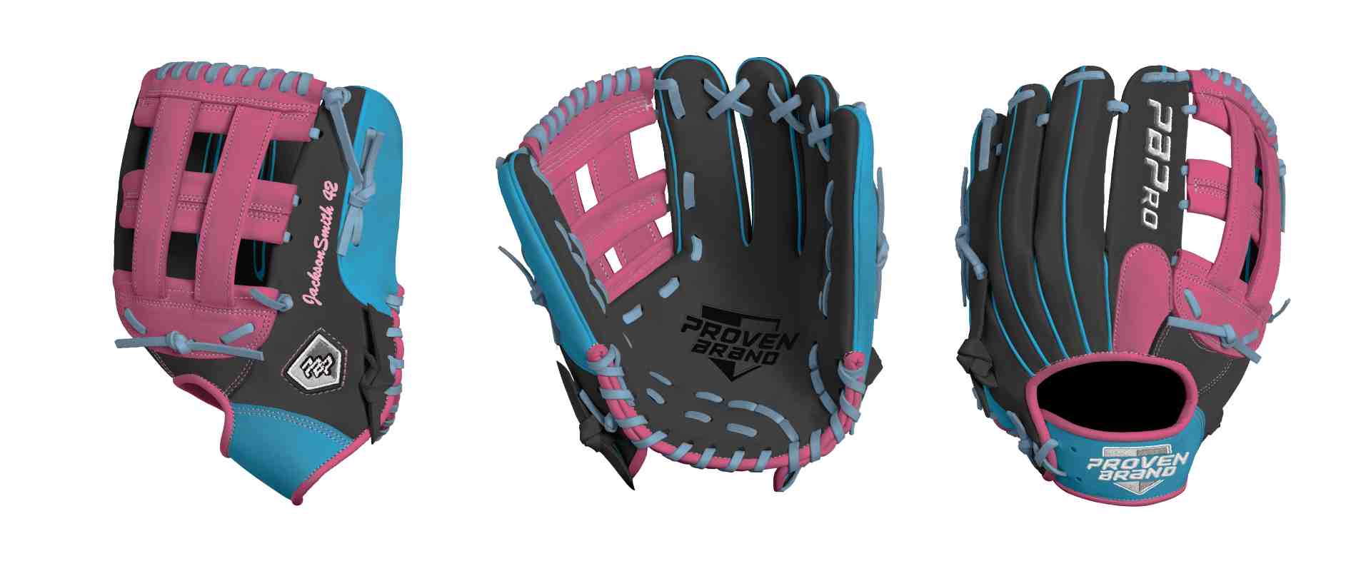 Category: PBPro Custom Product: Baseball Series: Phantom Series | USD 169.00 Glove Type: Fielders Size: 12.25" Finger Pad: With Finger Pad Web: Pro H Web Palm: Palm (Color: Black) Back Shell Main: Back Shell Main (Color: Black) Back Shell Accent: Back Shell Accent (Color: Sea Blue) Web: Web (Color: Shocking Pink) Finger Pad: Finger Pad (Color: Shocking Pink) Welting: Welting (Color: Sea Blue) Binding: Binding (Color: Shocking Pink) Lace: Lace (Color: Sky Blue (#7BAED3)) Logo and Label-flat: Logo and Label-flat (Color: White) Stitch: Stitch (Color: Carnation Pink) Embroidery: Embroidery (Color: White) Hand Throw: Right Hand Thrower Lace Length: Normal Flex (will not show in customizer): Pro Flex: (Ideal for Pro Player who wants to have more control in forming the glove) Wrist Opening (will not show in customizer): Standard Wrist Name: JacksonSmith 42 (Font Style: Brush Script MT, Font Color: Carnation Pink, Patch Color: N/A) Flag (Ring Finger): United States | USD 4.00 Remarks: N/A