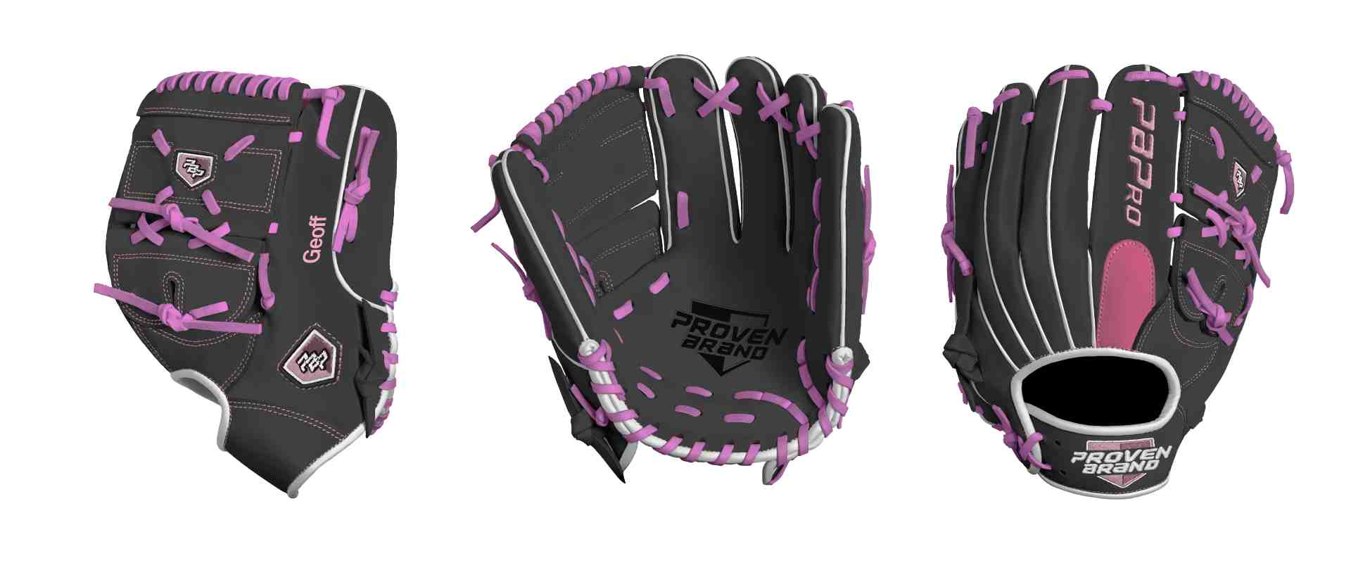 Category: PBPro Custom Product: Baseball Series: Phantom Series | USD 169.00 Glove Type: Fielders Size: 11.75" Finger Pad: With Finger Pad Web: Two Piece Web Palm: Palm (Color: Black) Back Shell Main: Back Shell Main (Color: Black) Back Shell Accent: Back Shell Accent (Color: Black) Web: Web (Color: Black) Finger Pad: Finger Pad (Color: Shocking Pink) Welting: Welting (Color: White) Binding: Binding (Color: White) Lace: Lace (Color: Pink (#EF73DB)) Logo and Label-flat: Logo and Label-flat (Color: Carnation Pink) Stitch: Stitch (Color: Carnation Pink) Embroidery: Embroidery (Color: Carnation Pink) Hand Throw: Right Hand Thrower Lace Length: Long (will not show in customizer) Flex (will not show in customizer): Pro Flex: (Ideal for Pro Player who wants to have more control in forming the glove) Wrist Opening (will not show in customizer): Standard Wrist Name: Geoff (Font Style: Pontano Sans, Font Color: Carnation Pink, Patch Color: N/A) Flag (Ring Finger): United States | USD 4.00 Remarks: N/A