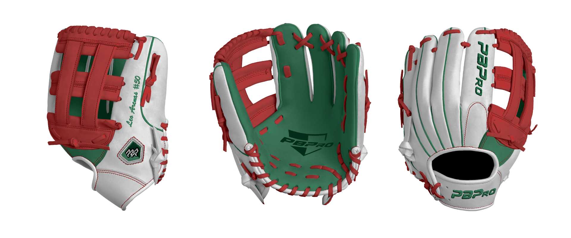Category: PBPro Custom Product: Baseball Series: Phantom Series | USD 159.00 Glove Type: Fielders Size: 12" Finger Pad: With Finger Pad Web: Pro H Web Palm: Palm (Color: Green) Back Shell Main: Back Shell Main (Color: White) Back Shell Accent: Back Shell Accent (Color: White) Web: Web (Color: Red) Finger Pad: Finger Pad (Color: White) Welting: Welting (Color: Green) Binding: Binding (Color: White) Lace: Lace (Color: Red) Logo and Label: Logo and Label (Color: Green) Stitch: Stitch (Color: Red) Embroidery: Embroidery (Color: Green) Hand Throw: Right Hand Thrower Lace Length: Normal Name: Leo Arenas #50 (Font Style: Brush Script MT, Font Color: Green, Patch Color: N/A) Flag (Ring Finger): Mexico Remarks: N/A